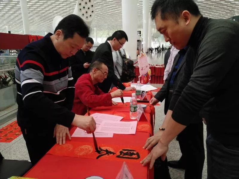 ▲旅客們請(qǐng)書法家們寫春聯(lián),把“?!睅Щ丶?