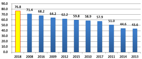 根據全市區(qū)域自動氣象站臺風風雨影響綜合年景指數(shù)計算結果,2018年臺風風雨影響綜合年景指數(shù)達到76.8,成為2008年以來最嚴重的一年,超過2008年的71.4。