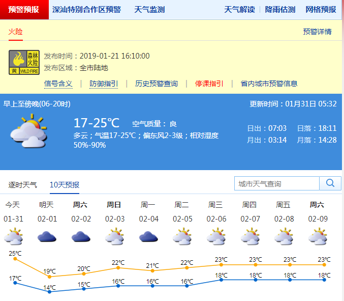 深圳新聞網(wǎng)2019年1月31日訊 深圳氣象局預(yù)計(jì)31日陰天間多云,偶有零星小雨,有輕霧或輕微霾,氣溫16-25℃;1-5日陰天間多云,部分時(shí)間可見陽光,間中有零星小雨,氣溫小幅波動(dòng),其中1日受冷空氣影響,沿海和高地偏北風(fēng)最大陣風(fēng)7級(jí),最低氣溫略降3℃左右,3-4日暖濕氣流加強(qiáng),早晚有輕霧或霧。