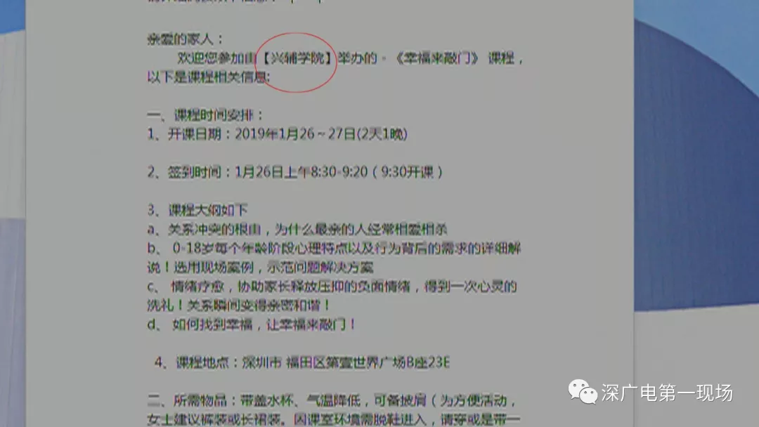 深廣電第一現場2019年2月1日訊 寒假前夕,龍華區(qū)不少家長向我們欄目反映,從上學期開始他們通過學校老師的介紹,接觸到了一個教育機構。這個校外的培訓機構,主要給家長傳授親子教育和家庭相處的技巧,按說這應該是一件好事,可是一些家長卻發(fā)現,參加了一些課程之后,不光家庭關系沒有變好,反而帶來了不少家庭矛盾?