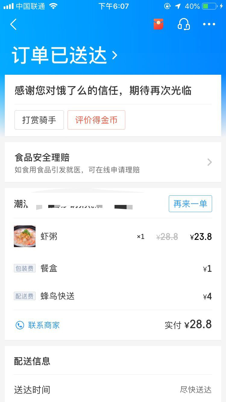 2月12日上午10點(diǎn)多,市民黃先生在餓了么外賣(mài)平臺(tái)點(diǎn)了一份潮汕砂鍋粥。2個(gè)小時(shí)后,肚子快餓癟的黃先生等到了外賣(mài)小哥的電話。外賣(mài)小哥告訴他,外賣(mài)在電動(dòng)車(chē)上被偷了,對(duì)此很抱歉,麻煩黃先生重新點(diǎn)餐,并希望添加他的微信進(jìn)行賠償。