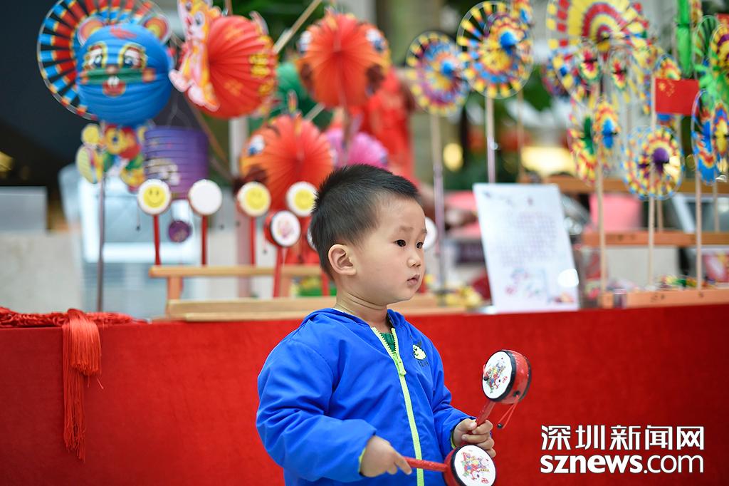 風(fēng)車攤檔前面,一位拿著撥浪鼓的小男孩駐足觀看節(jié)目