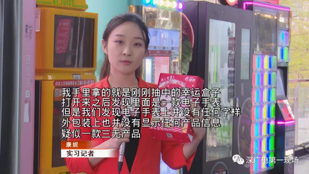 記者注意到,這家商場里擺放的除了口紅機(jī)外,還有所謂的“幸運(yùn)禮盒”機(jī),這個(gè)機(jī)器外型與自動(dòng)售貨機(jī)相似,游戲規(guī)則更加簡單粗暴,只要掃碼付款三十元,就能得到一個(gè)幸運(yùn)禮盒。但禮盒里的獎(jiǎng)品卻讓記者大跌眼鏡。