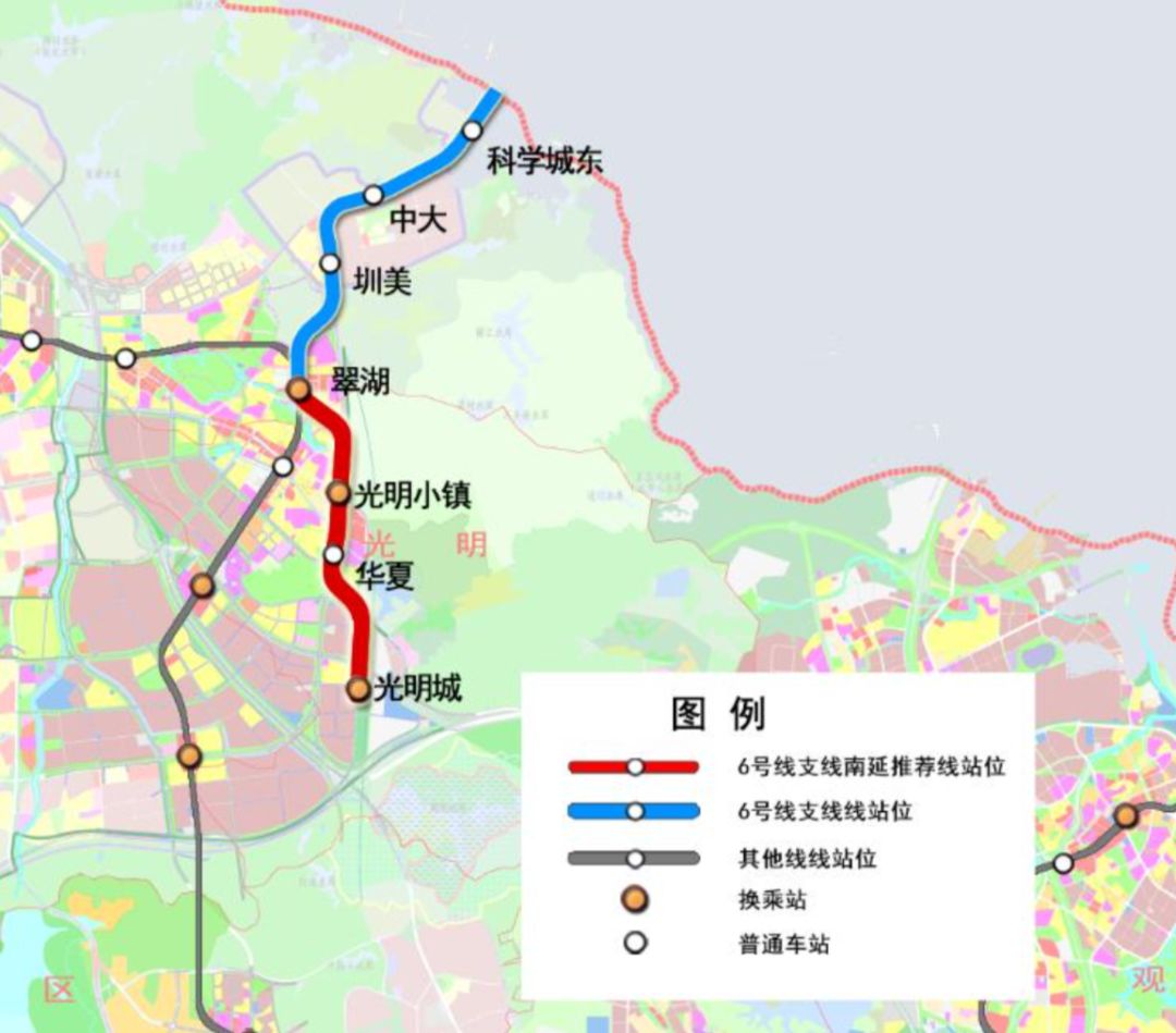 6號(hào)線支線是地鐵四期開(kāi)工的5條線路之一,也是深圳和東莞之間第一條確定直連貫通的地鐵線路。6號(hào)線支線南延起于翠湖站南側(cè),向南沿光明大道高架敷設(shè),最終在廣深港高鐵光明城站的站前廣場(chǎng)設(shè)置光明城站,并與13號(hào)線北延相交。