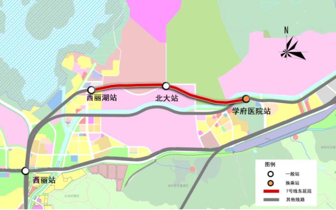 7號(hào)線東延起于既有7號(hào)線西麗湖站后,往東穿越深圳野生動(dòng)物園,進(jìn)入麗水路后于北大西門(mén)麗水路于西麗春園路交叉口處設(shè)置北大站,后穿過(guò)西麗高爾夫鄉(xiāng)村俱樂(lè)部與大沙河,于學(xué)苑大道與幽蘭路的交叉口設(shè)終點(diǎn)站學(xué)府醫(yī)院站。
