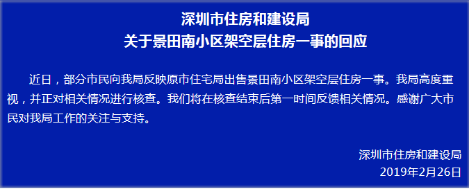 深圳新聞網(wǎng)2019年2月26日訊 近日,有網(wǎng)友爆料原深圳市住宅局出售景田南小區(qū)架空層住房一事。2月26日,深圳市住房和建設(shè)局關(guān)于景田南小區(qū)架空層住房一事做出了回應(yīng)。