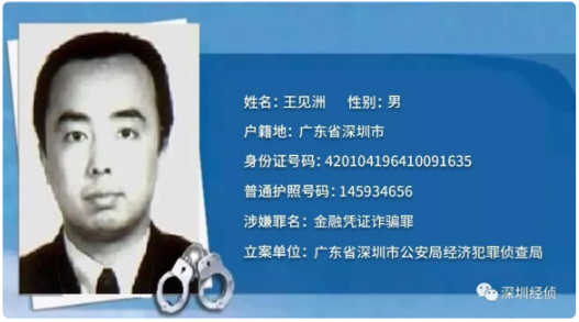 犯罪嫌疑人姓名:王見洲,男,1964年10月9日生,漢族,籍貫湖北省武漢市,戶籍地廣東省深圳市,身份證號碼:420104196410091635,普通護(hù)照號碼:145934656,原中國工商銀行深圳分行紅圍支行泥崗辦事處副主任。因涉嫌金融憑證詐騙罪于1998年12月潛逃出境。國際刑警組織于2016年11月14日對王見洲發(fā)布紅色通報。