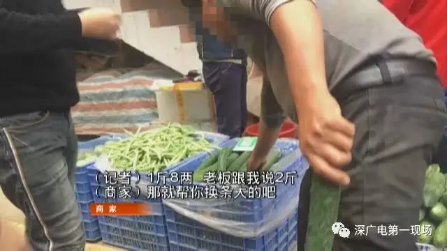 隨后,記者再次來到另外一家蔬菜攤檔,同樣選購了兩根黃瓜,商家稱重同樣顯示的是兩斤,不過當(dāng)記者把自己的便攜秤掏出來之后,商家這回給自己變了個(gè)戲法,說要給記者換條大的。