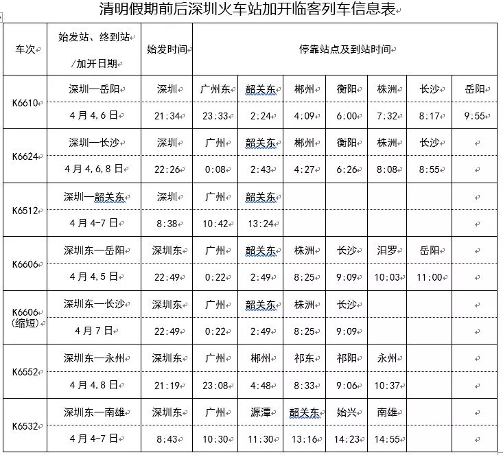 深圳站將加開3對(duì)臨客列車,始發(fā)車次為開往岳陽的K6610次、開往長沙的K6624次和開往韶關(guān)東的K6512次;