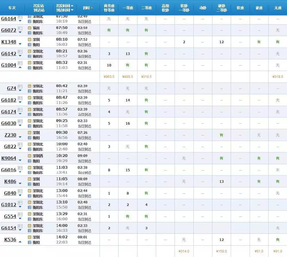 從深圳到衡陽(yáng),最快是2小時(shí)31分,票價(jià)最低為123元。