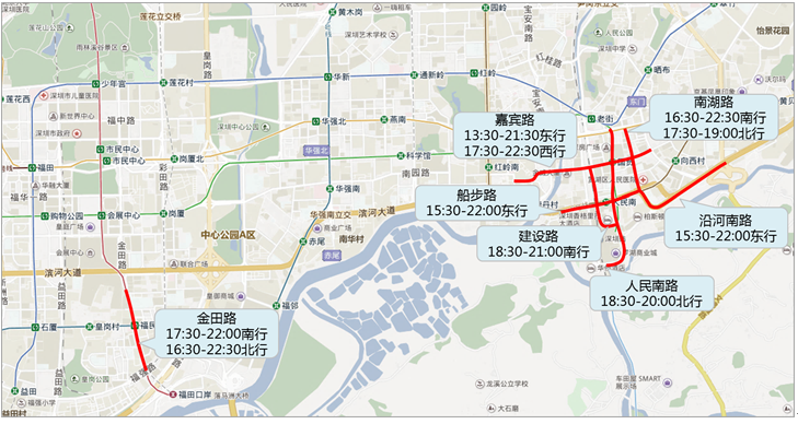 預(yù)計(jì)主要擁堵路段有鵬興路(13:30-19:30南行、09:30-14:30北行)、仙湖路(10:00-14:30南行、10:00-16:00北行)、國威路(11:30-12:30東行)、聚寶路(10:30-13:30南行、14:30-16:30北行)、蓮塘路(09:30-11:30東行、12:30-15:30西行)。