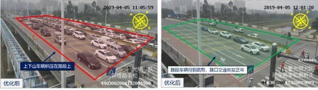 深圳交警采用遠(yuǎn)程步控及路面手動(dòng)控制及時(shí)疏散積壓排隊(duì)車輛,約中午12點(diǎn)路面車流量逐漸減少,路口交通恢復(fù)正常。