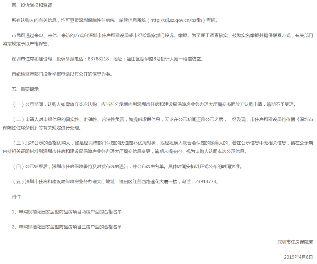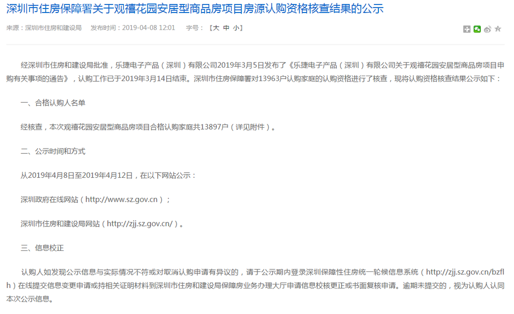 深圳新聞網(wǎng)2019年4月9日訊(記者 劉婷)記者從市住房保障署獲悉,觀禧花園安居型商品房項(xiàng)目認(rèn)購(gòu)工作已經(jīng)結(jié)束。經(jīng)核查,該項(xiàng)目合格認(rèn)購(gòu)家庭共13897戶,合格家庭名單自4月8日至4月12日在深圳政府在線和深圳市住房(http://www.sz.gov.cn)和建設(shè)局(http://zjj.sz.gov.cn/)網(wǎng)站公示。