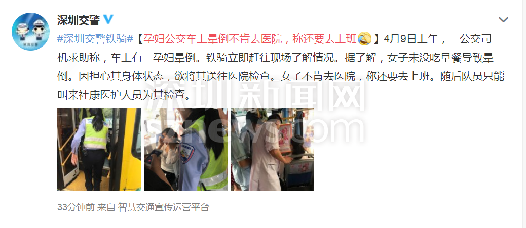 深圳新聞網(wǎng)2019年4月9日訊(記者 施冰冰)記者從“深圳交警”處了解到,4月9日上午,有公交司機求助稱,車上有一孕婦暈倒。鐵騎立即趕往現(xiàn)場了解情況。據(jù)了解,女子未沒吃早餐導(dǎo)致暈倒。因擔(dān)心其身體狀態(tài),欲將其送往醫(yī)院檢查。女子不肯去醫(yī)院,稱還要去上班。隨后隊員只能叫來社康醫(yī)護人員為其檢查。
