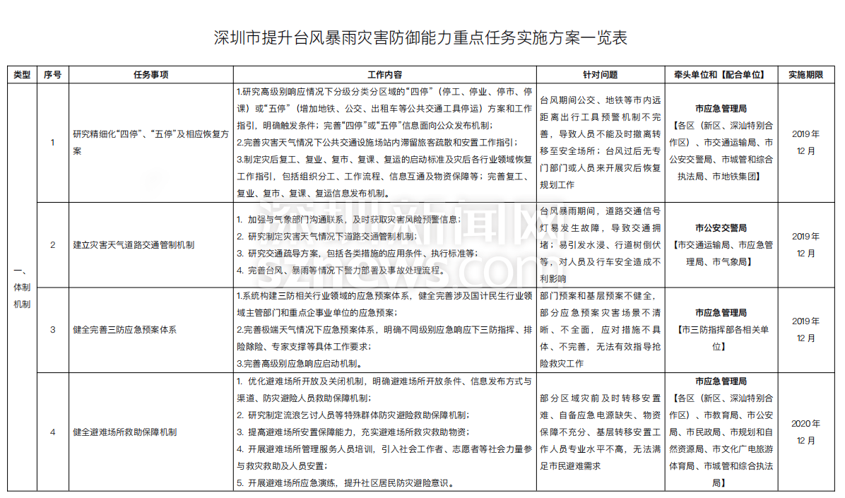 附:《深圳市提升臺風(fēng)暴雨災(zāi)害防御能力重點任務(wù)實施方案一覽表》