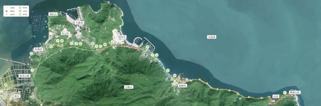 大鵬新區(qū)根據(jù)線路的地形、山海景觀、人文景觀的分布,確定了“打造‘兩線、三段、五大節(jié)點(diǎn)’的濱海生態(tài)自然課堂步道”。據(jù)新區(qū)建筑工務(wù)局負(fù)責(zé)人介紹,從新大河入??诘酱髞啚澈0堵咕讘已?,全長(zhǎng)18.7公里的海岸線上分布著河流、山林、海灘、溪流、濕地等多樣生態(tài)系統(tǒng)。2017年7月,大鵬新區(qū)按照濱海慢行系統(tǒng)示范工程標(biāo)準(zhǔn),動(dòng)工建設(shè)新大-鹿嘴市政綠道?!皟删€”指的是沿著海岸的濱海徒步路線和城市二號(hào)綠道線,兩條線之間的6.6平方公里土地將形成一座開放的郊野公園;“三段”分別為活力生活段、自然生態(tài)段和休閑旅游段;“五大節(jié)點(diǎn)”為山海綠畔、古廟遺風(fēng)、東山凹、愛情灘、鹿咀山莊等自然景觀。