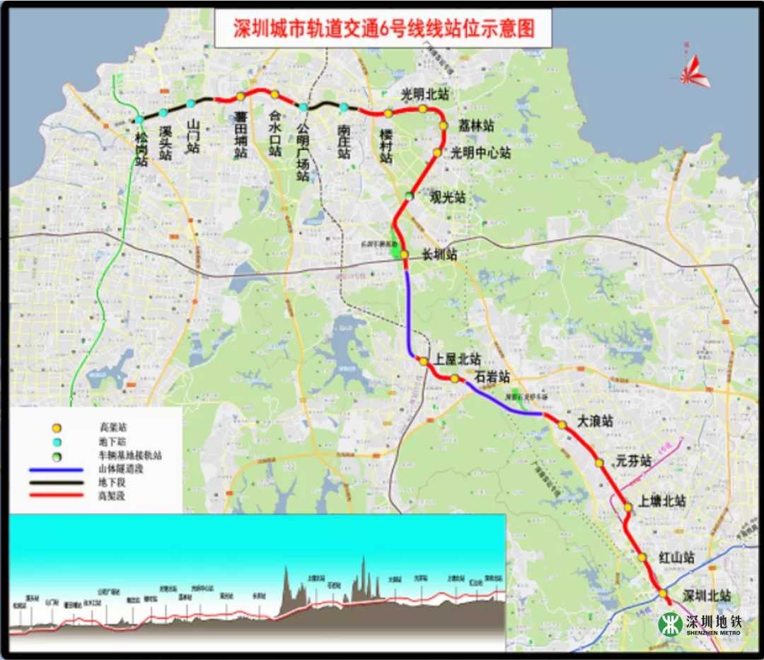 深圳地鐵6號線一期工程全長約49.4km,其中一期工程長約37.6km,起自深圳北站綜合交通樞紐,終止于松崗站,設(shè)車站20座(其中地下站5座,高架站15座),與4、5、11、13、15號線及廣深港客運(yùn)專線綜合換乘。
