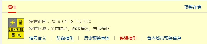 深圳市氣象臺(tái)于2019年04月18日16時(shí)15分在全市發(fā)布雷電預(yù)警,預(yù)計(jì)30-60分鐘內(nèi)全市將逐漸自西向東轉(zhuǎn)雷陣雨,按照防御預(yù)案停止戶外易燃易爆危險(xiǎn)作業(yè),并加強(qiáng)?;瘓鏊踩芾?,正值下班放學(xué)高峰期,請注意防御。