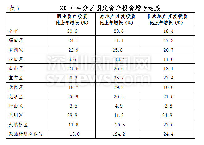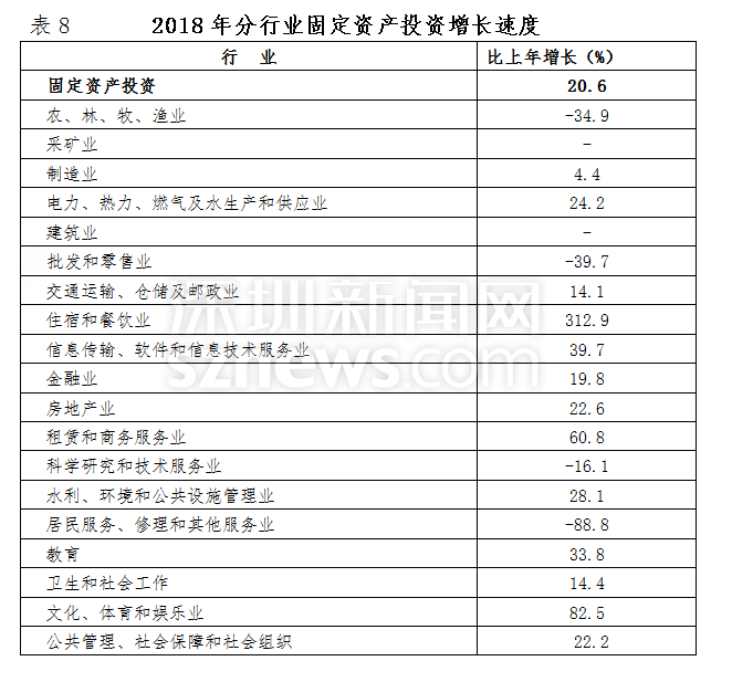 2018年,深圳全市固定資產(chǎn)投資比上年增長(zhǎng)20.6%。其中,房地產(chǎn)開(kāi)發(fā)投資增長(zhǎng)23.6%;非房地產(chǎn)開(kāi)發(fā)投資增長(zhǎng)18.4%。分投資主體看,國(guó)有經(jīng)濟(jì)投資增長(zhǎng)36.7%;民間投資增長(zhǎng)12.5%;港澳臺(tái)商經(jīng)濟(jì)投資下降22.6%;外商經(jīng)濟(jì)投資增長(zhǎng)30.3%。