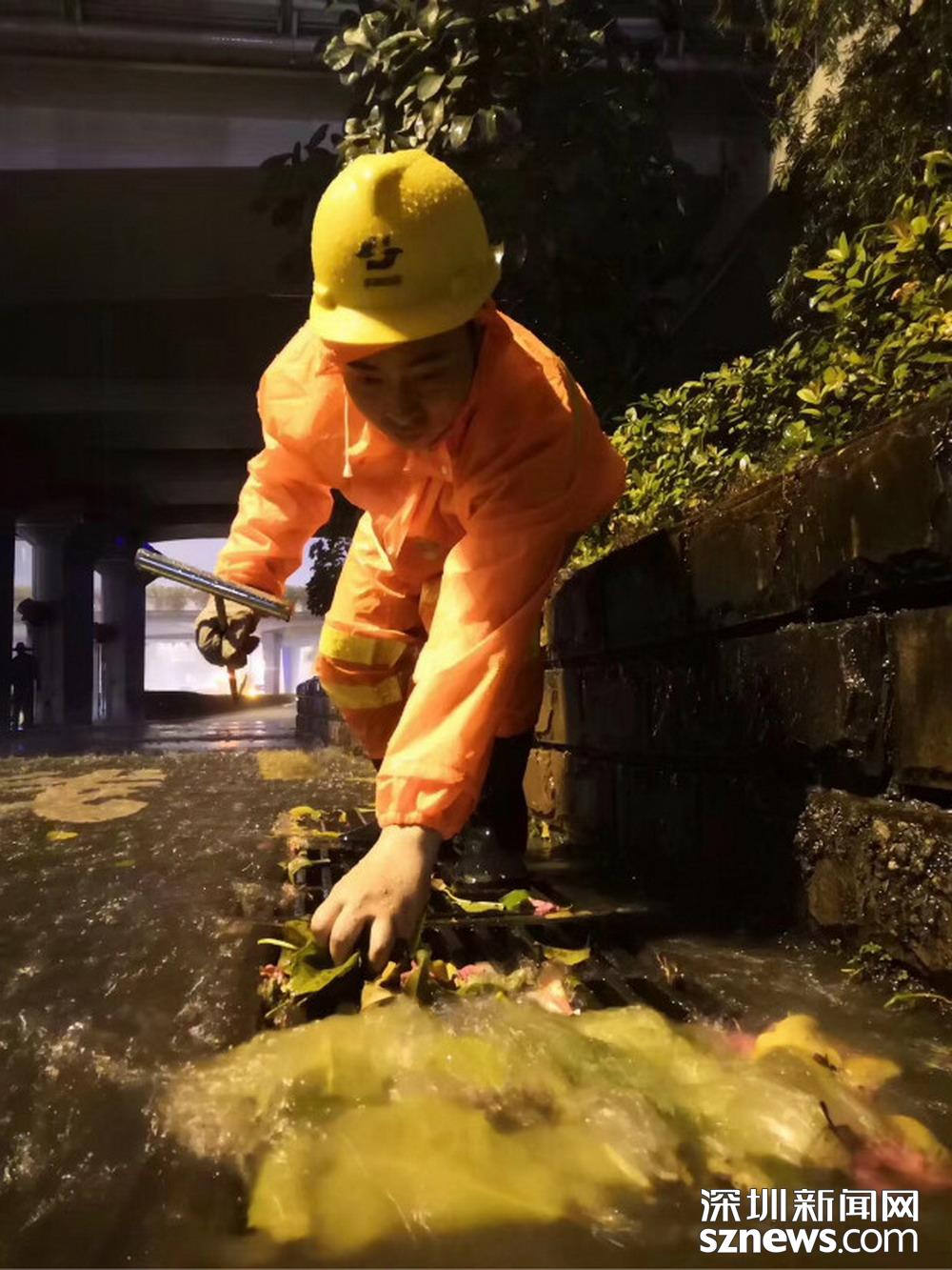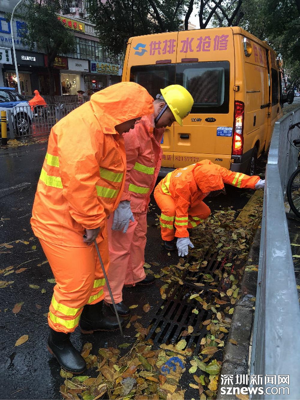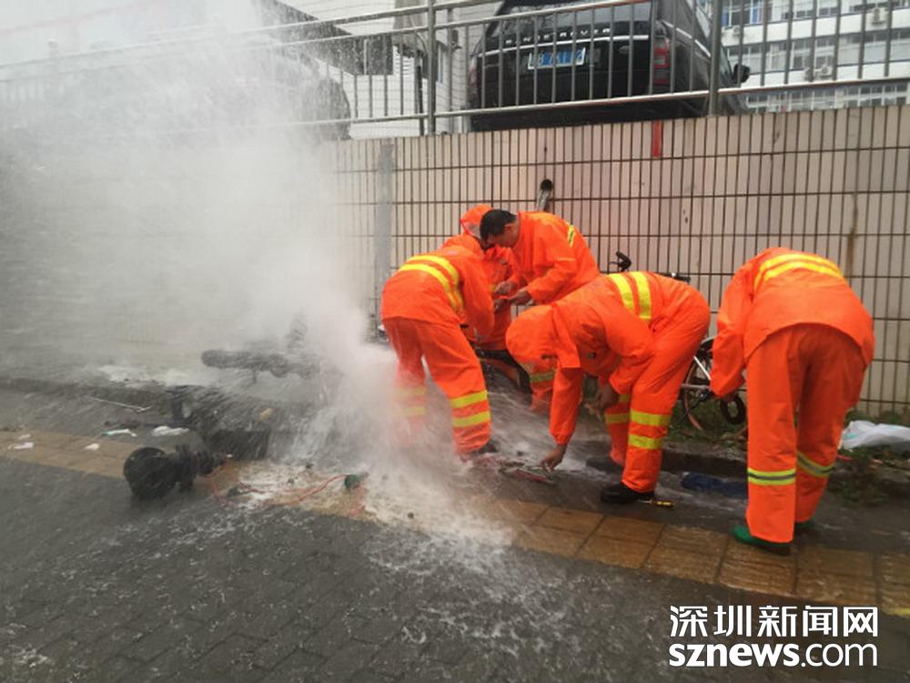 福田區(qū)深南路證券大廈前,工作人員正打開(kāi)雨水篦子加速排水