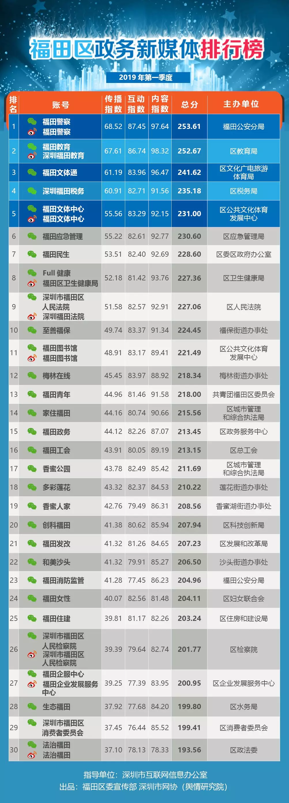 榜單根據(jù)新媒體屬性以及政務(wù)信息公開工作特點,將福田區(qū)各政務(wù)部門及公營單位開設(shè)的新媒體賬號,按照傳播指數(shù)(100分)、內(nèi)容指數(shù)(100分)、服務(wù)指數(shù)(100分)三項指標(biāo)進(jìn)行綜合評價,計分排名,形成榜單。