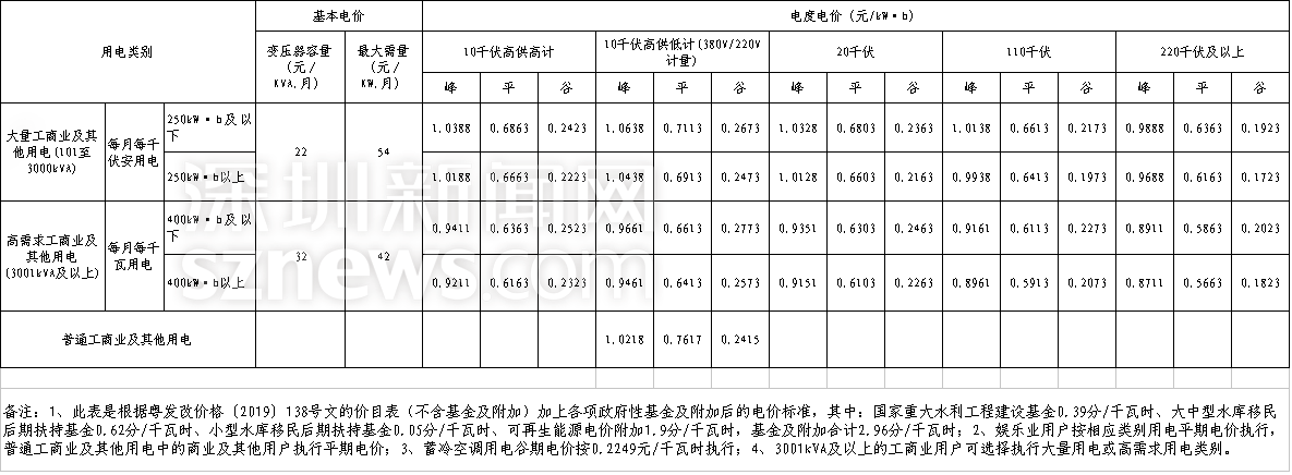深圳市工商業(yè)電價(jià)價(jià)目表(從2019年4月1日起執(zhí)行)