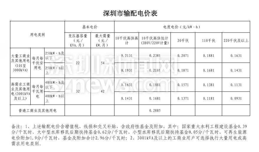 深圳市輸配電價(jià)價(jià)目表(從2019年4月1日起執(zhí)行)