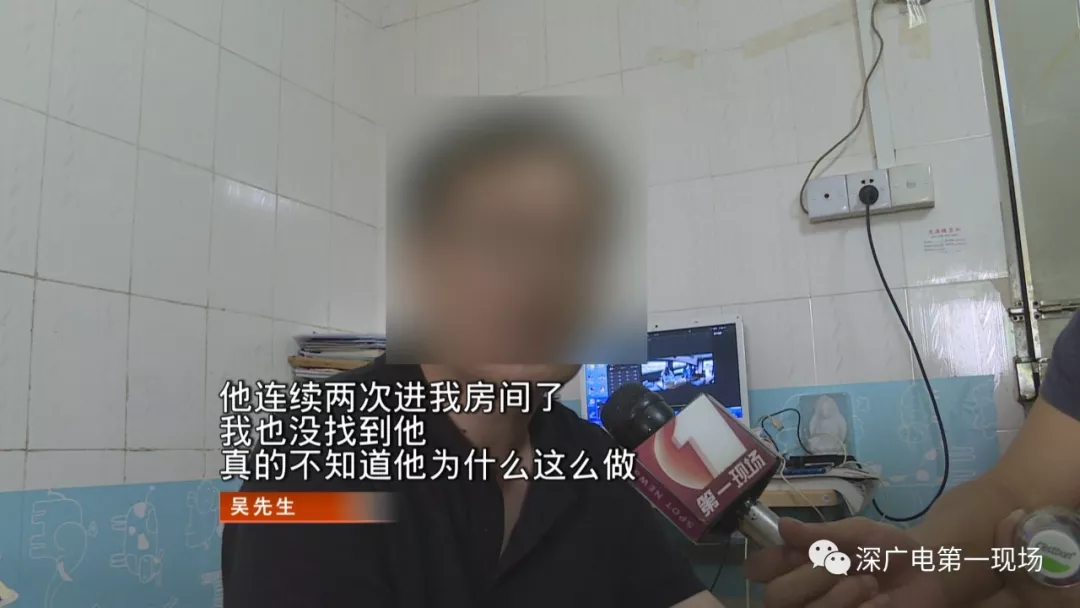 被驚醒的吳先生發(fā)現(xiàn)后,男子在7點(diǎn)19分離開(kāi)吳先生房間??吹竭@兩段監(jiān)控,吳先生有點(diǎn)后怕。