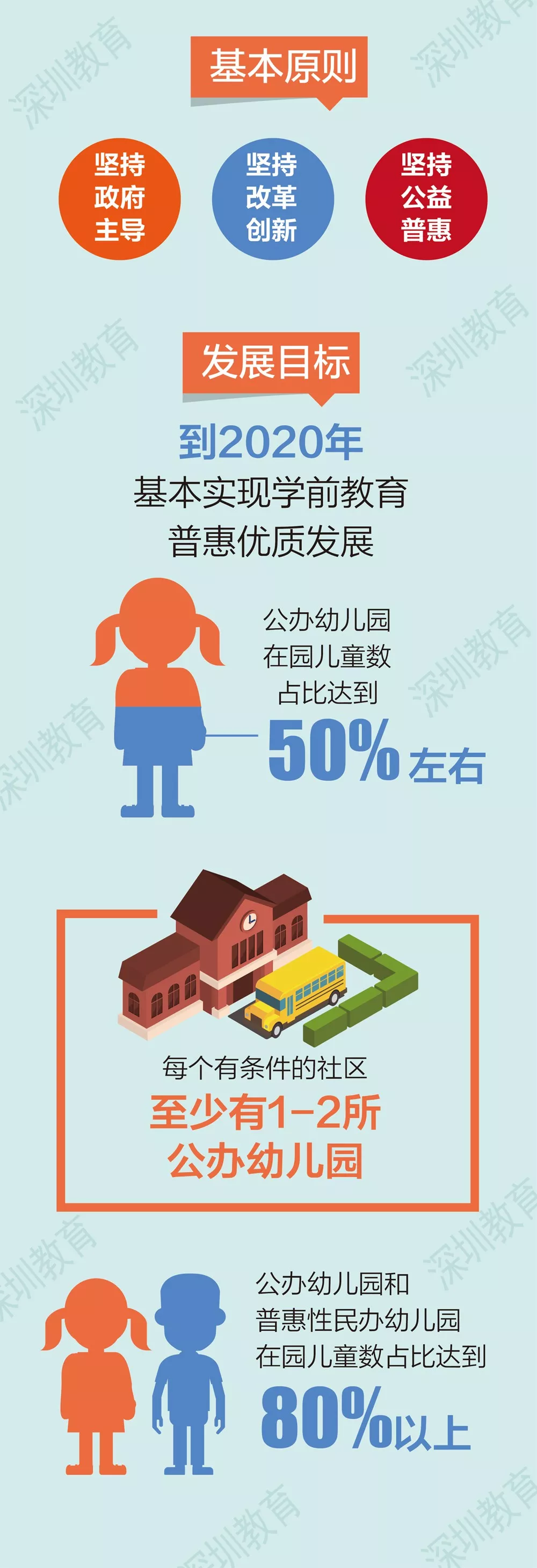 目前深圳共有各類幼兒園1771所,其中,公辦幼兒園共68所,占比僅3.8%。根據(jù)《意見(jiàn)》及《通知》的內(nèi)容,到2020年,全市幼兒園總量預(yù)計(jì)達(dá)到1967所,其中公辦園和普惠性幼兒園占比達(dá)到80%以上,公辦園約984所,在園兒童占比達(dá)到50%;普惠性民辦幼兒園約590所,占比30%以上;營(yíng)利性民辦幼兒園393所,占比20%以內(nèi)。深圳將用3-5年時(shí)間,基本實(shí)現(xiàn)學(xué)前教育普惠優(yōu)質(zhì)多樣化發(fā)展。