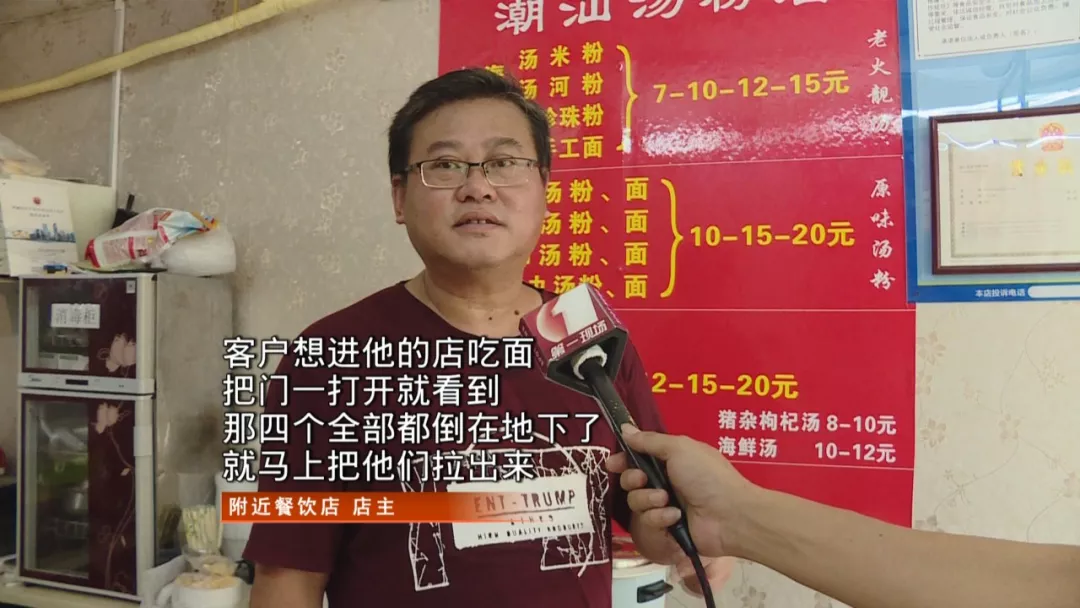 店鋪打開門后,食客發(fā)現(xiàn)店內(nèi)有四名人員倒地,大家立即將他們拉出來,并將店門敞開通風(fēng),撥打了120急救。