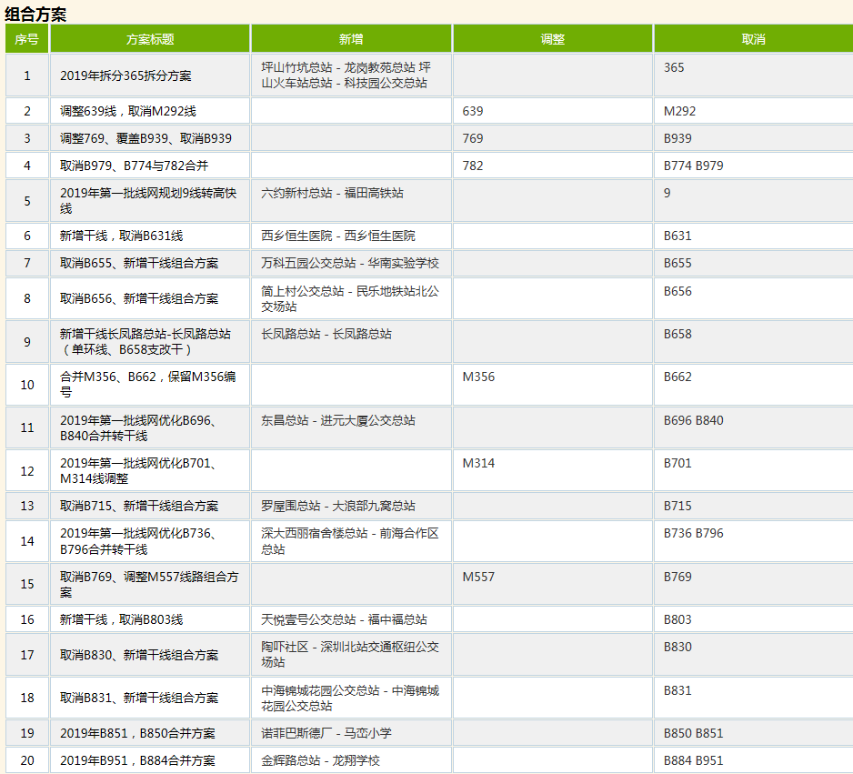 深圳新聞網(wǎng)5月20日訊(記者 涂勝)5月20日下午,深圳市交通運輸局發(fā)布關(guān)于征求《2019年第一批公共汽車線路規(guī)劃方案》(征求意見稿)意見的通告。記者從規(guī)劃方案中的獲悉,本次線路公共汽車線路規(guī)劃方案以完成各區(qū)骨干網(wǎng)搭建及區(qū)域間快線、骨干線網(wǎng)銜接為工作重點,共包含線路方案63個,涉及線路79條(其中,新增5條,調(diào)整24條,合并、取消50條,運力從原特區(qū)內(nèi)向原特區(qū)外轉(zhuǎn)移58臺)。