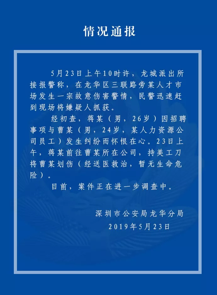據(jù)警方通報(bào),嫌疑人蔣某因招聘事項(xiàng)與某人力資源公司員工曹某發(fā)生糾紛,懷恨在心。23日上午,蔣某前往曹某所在公司,持美工刀將曹某劃傷。經(jīng)送醫(yī)救治,暫無(wú)生命危險(xiǎn),目前案件進(jìn)一步調(diào)查當(dāng)中。
