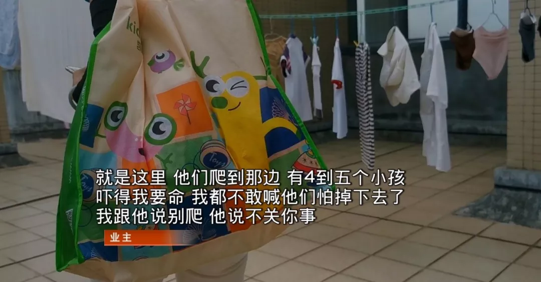 就在上周六,她親眼看到四五個(gè)孩子在天臺(tái)上四處攀爬,玩槍?xiě)?zhàn),攔都攔不住。