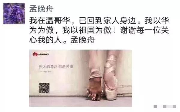 當(dāng)?shù)貢r(shí)間2018年12月1日,加拿大當(dāng)局應(yīng)美方要求,扣留了在加拿大機(jī)場轉(zhuǎn)機(jī)的孟晚舟,美國隨后承認(rèn),正在尋求對(duì)孟晚舟的引渡。10天之后,2018年12月11日,加拿大法院作出裁決,批準(zhǔn)孟晚舟的保釋申請(qǐng)。當(dāng)晚,走出法庭的孟晚舟發(fā)朋友圈表示,我以華為為傲,我以祖國為傲。配圖就是那張“芭蕾腳”的華為廣告圖,上面寫著:偉大的背后都是苦難。外界擔(dān)心,由于不斷升級(jí)的中美貿(mào)易摩擦,可能會(huì)影響到孟晚舟在加拿大的引渡訴訟。