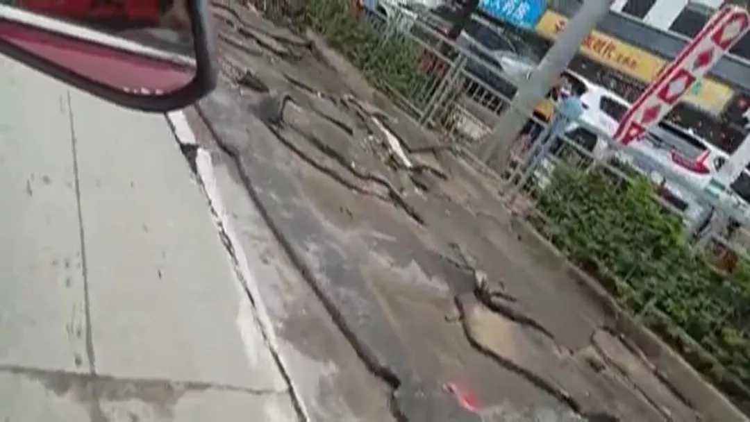 一場(chǎng)暴雨過后,寶安石巖石龍大道剛鋪好的瀝青路成了渣渣!