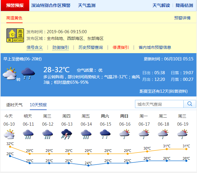 深圳新聞網(wǎng)2019年6月10日訊 在近幾日副熱帶高壓的影響下,深圳迎來(lái)了久違的“深圳藍(lán)”。不過(guò),市民們?cè)谙硎芡ㄍ傅乃{(lán)天夏日的同時(shí),也承受著不斷升溫的“燒烤模式”。2019年6月6日上午09時(shí)15分深圳市氣象臺(tái)發(fā)布了今年的首個(gè)高溫黃色預(yù)警信號(hào),2019年6月9日羅湖區(qū)東門(mén)自動(dòng)站記錄到36.2℃高溫。氣溫圖上一片橙色紅色,簡(jiǎn)直成了一只“紅燒雞腿”。