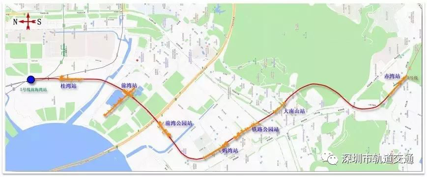 深圳地鐵5號(hào)線南延段,即5號(hào)線二期工程,北起于5號(hào)線前海灣站,經(jīng)前海、南山,終點(diǎn)與地鐵2號(hào)線赤灣站換乘。線路全長(zhǎng)約7.7千米,全線采用地下敷設(shè)方式,設(shè)站7座。