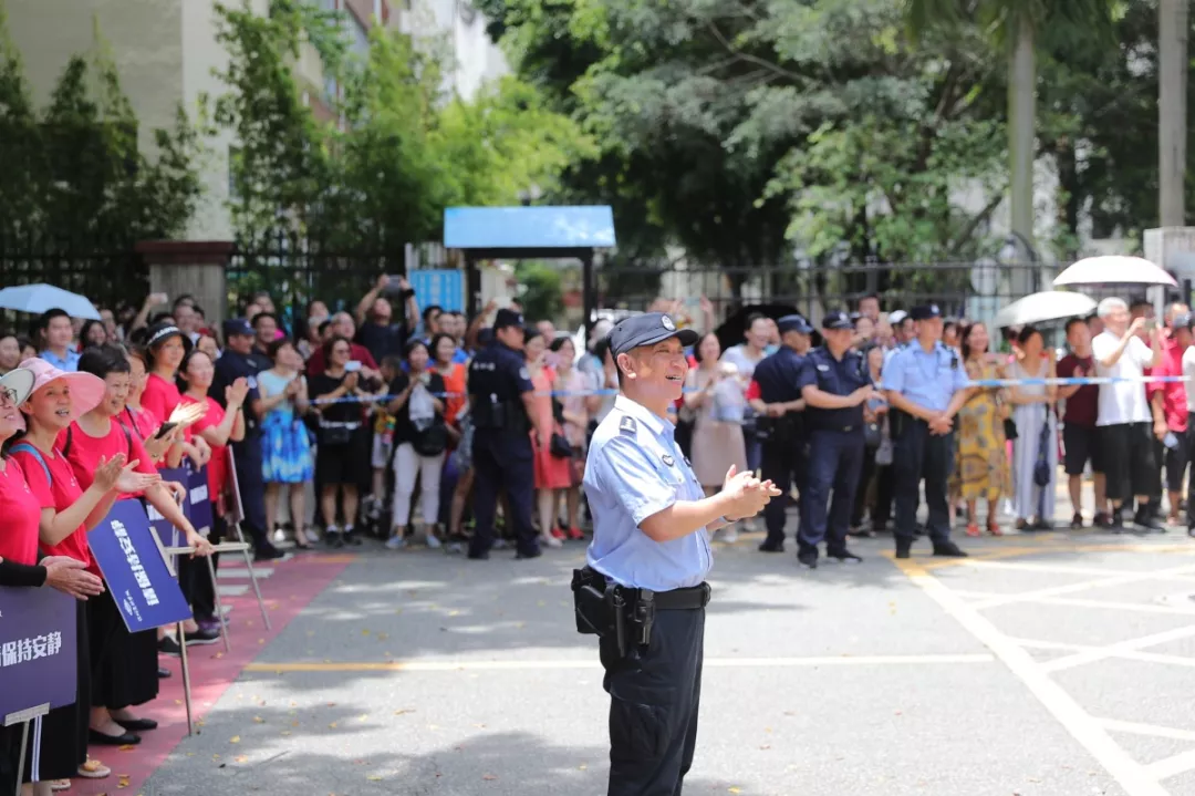△當(dāng)?shù)谝晃豢忌叱錾钲趯?shí)驗(yàn)學(xué)校中學(xué)部考場(chǎng)時(shí),通心嶺派出所所長(zhǎng)林志強(qiáng)與現(xiàn)場(chǎng)家長(zhǎng)為其鼓掌喝彩。