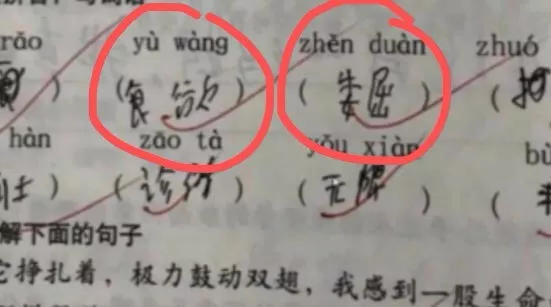 可是仔細一瞧,卻發(fā)現(xiàn)了蹊蹺。明明題目是讀拼音,寫詞語,可是孩子寫的詞語和上面的拼音,完全對不上號,老師卻依舊打了對勾。