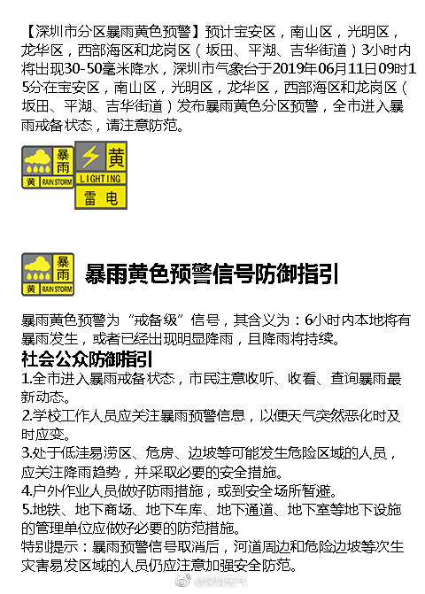 【深圳市分區(qū)暴雨黃色預(yù)警】預(yù)計寶安區(qū),南山區(qū),光明區(qū),龍華區(qū),西部海區(qū)和龍崗區(qū)(坂田、平湖、吉華街道)3小時內(nèi)將出現(xiàn)30-50毫米降水,深圳市氣象臺于2019年06月11日09時15分在寶安區(qū),南山區(qū),光明區(qū),龍華區(qū),西部海區(qū)和龍崗區(qū)(坂田、平湖、吉華街道)發(fā)布暴雨黃色分