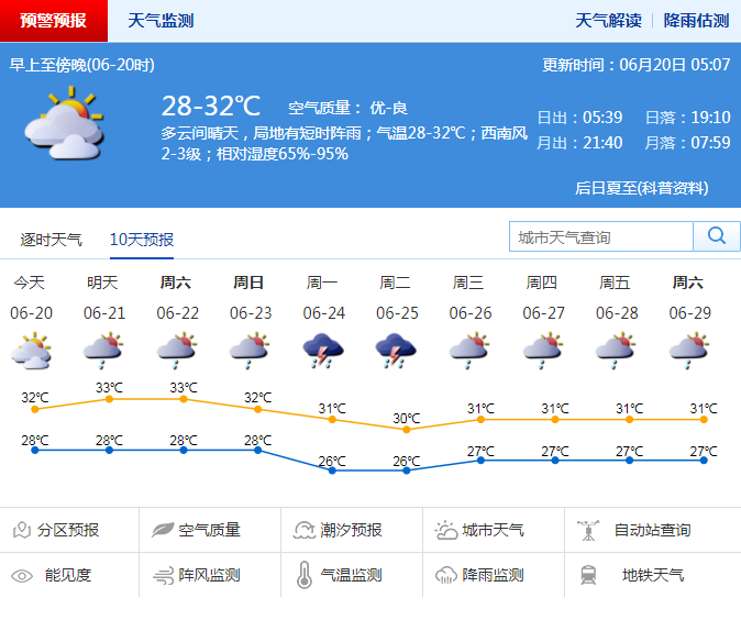 深圳新聞網(wǎng)2019年6月20日訊 19日深圳陽光陣雨相伴。早晨和中午前后出現(xiàn)陣性降水,雨量普遍在10毫米以下,全市最大雨量32.7毫米,出現(xiàn)在寶龍街道三棵松站,這也是唯一一個(gè)大雨點(diǎn)。早晨最低氣溫26-28℃,白天最高氣溫在31-33℃,寶安區(qū)西北部達(dá)34-35℃,濕度較大,體感悶熱。