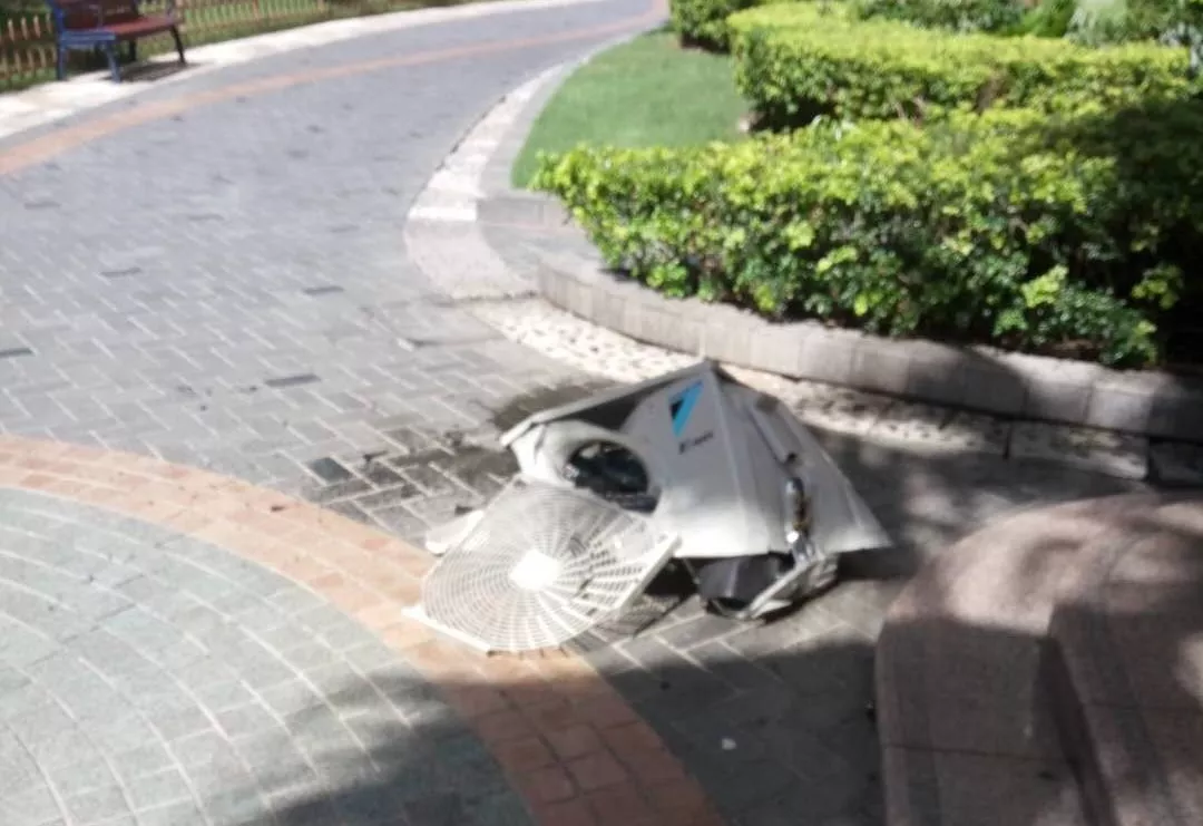 深廣電第一現(xiàn)場(chǎng)2019年7月1日訊 今天下午,福田區(qū)萬科金色家園小區(qū)一臺(tái)空調(diào)主機(jī)從11樓墜下!巨大的聲音把業(yè)主嚇得不輕?。?!空調(diào)外機(jī)應(yīng)該是固定好的怎么就會(huì)掉下來了?