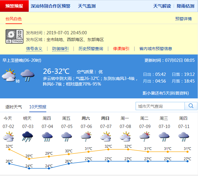 深圳新聞網(wǎng)2019年07月02日訊 深圳市氣象臺(tái)已于昨日20時(shí)45分發(fā)布臺(tái)風(fēng)白色預(yù)警信號(hào),預(yù)計(jì)其將可能在48小時(shí)內(nèi)影響我市,全市進(jìn)入臺(tái)風(fēng)注意狀態(tài)。氣象臺(tái)預(yù)計(jì),今日白天深圳風(fēng)力逐漸加大,最大陣風(fēng)7級(jí)左右,午后降雨漸趨頻密,局部大雨,夜間降雨加大,有大雨到暴雨,局部大暴雨,請(qǐng)做好防范準(zhǔn)備!