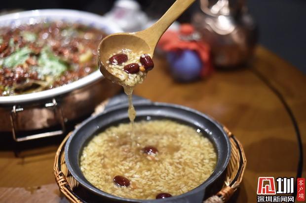 紅糖陰米粥作為主食,溫潤甘甜,口感濃稠,小米粥里熬煮了紅棗枸杞,補(bǔ)血補(bǔ)氣,在一眾重油的江湖菜中可以解辣解膩,還能感受酒糟帶來的養(yǎng)生驚喜。