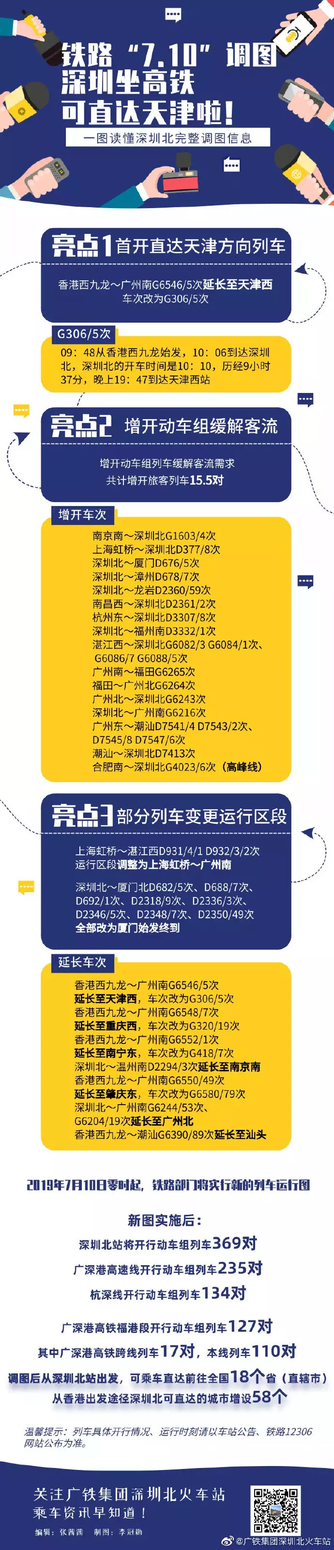 根據(jù)新的運(yùn)行圖安排,深圳北站將開行動(dòng)車組列車369對(duì),廣深港高速線開行動(dòng)車組列車235對(duì);杭深線開行動(dòng)車組列車134對(duì)?!?·10”調(diào)圖后,深圳北站首開前往天津方向列車,屆時(shí)從深圳北站出發(fā),可乘車直達(dá)前往全國18個(gè)?。ㄖ陛犑校?;從香港出發(fā)途徑深圳北可直達(dá)的城市增設(shè)58個(gè)。