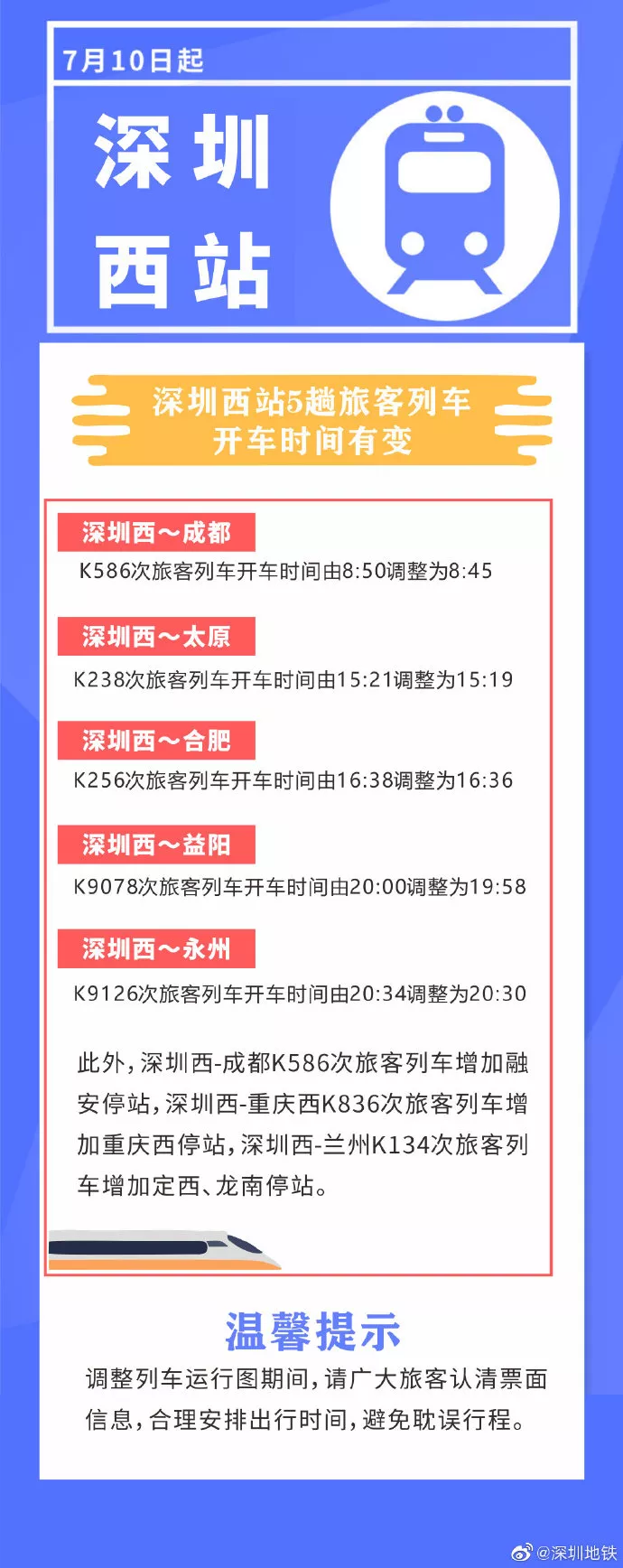 深圳西站有5趟旅客列車開車時(shí)間有變,3趟旅客列車增加停車站。