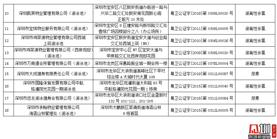 記者獲悉,深圳市夢(mèng)六健身有限公司(游泳池)pH值和游離性余氯指標(biāo)不合格,深圳市百利行物業(yè)發(fā)展有限公司中信紅樹灣花城物業(yè)管理處(游泳池)、深圳市大成健身有限責(zé)任公司(游泳池)、深圳市悠友游泳健身會(huì)有限公司(游泳池)尿素指標(biāo)不合格,加福投資(深圳)有限公司福朋喜來登酒店(游泳池)、深圳市蓮花物業(yè)管理有限公司彩田村游泳場(chǎng)、深圳大中華國際酒店管理有限公司大中華希爾頓酒店(游泳池)、深圳市京基物業(yè)管理有限公司濱河時(shí)代物業(yè)服務(wù)中心(游泳池)、深圳新都酒店股份有限公司新都酒店(游泳池)、深圳陽光酒店(游泳池)、深圳市金地物業(yè)管理有限公司翠盈嘉園管理處(游泳池)、深圳凱萊物業(yè)管理有限公司(游泳池)、深圳市寶繽物業(yè)服務(wù)有限公司(游泳池)、深圳市鴻榮源物業(yè)管理有限公司西城上筑游泳池、深圳市鴻榮源物業(yè)管理有限公司(西岸觀?。ㄓ斡境兀⑸钲谑腥f商通會(huì)所管理有限公司(游泳池)、深圳市國隆體育發(fā)展有限公司中航格瀾陽光花園一期游泳池、深圳市承翰物業(yè)管理有限公司海語山林管理處(游泳池)游離性余氯指標(biāo)不合格。衛(wèi)生監(jiān)督部門已責(zé)令抽檢結(jié)果不合格單位立即整改,并跟蹤整改情況。