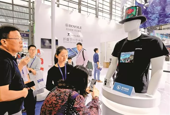 ▲圖為柔宇公司展示可以穿戴在身上的薄膜顯示器。深圳特區(qū)報(bào)記者 李偉文 攝