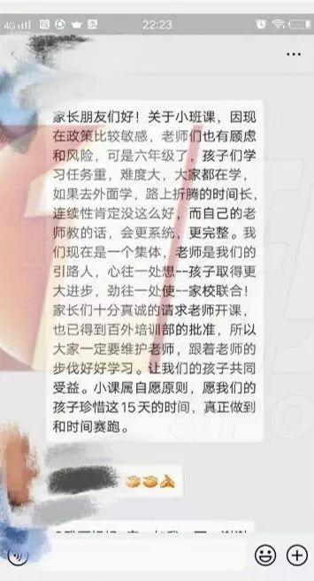 從家長(zhǎng)提供的班群聊天記錄可以看到,班主任表示:由于很多家長(zhǎng)想讓孩子提前搶時(shí)間,所以爭(zhēng)取到了小課機(jī)會(huì),也已經(jīng)得到了批準(zhǔn)。