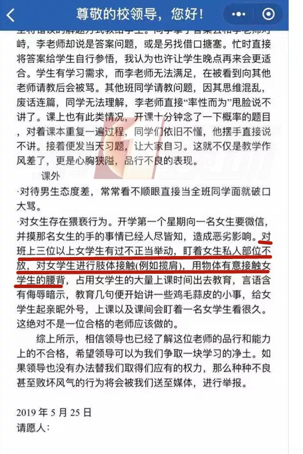 李先生向記者提供了一份,據(jù)稱是學生寫的聯(lián)名信,關(guān)于這位老師的不當品行,其中寫道“對班上三位以上女學生有過不正當舉動,盯著女生私人部位不放,對女學生進行肢體接觸,例如攬肩,用物體有意接觸女學生的腰背,給女生起親昵外號”。